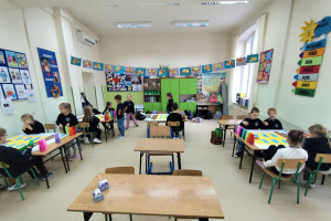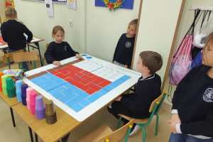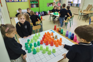 Podczas zajęć dzieci wysłuchały krótkich rymowanek i prostych poleceń, a następnie na ich podstawie układały obrazki na macie. Każde zadanie wymagało od nich uważnego słuchania, analizy i współpracy w grupie. Kolorowe rekwizyty pomagały najmłodszym lepiej zrozumieć kierunki, sekwencje oraz podstawowe pojęcia programistyczne.