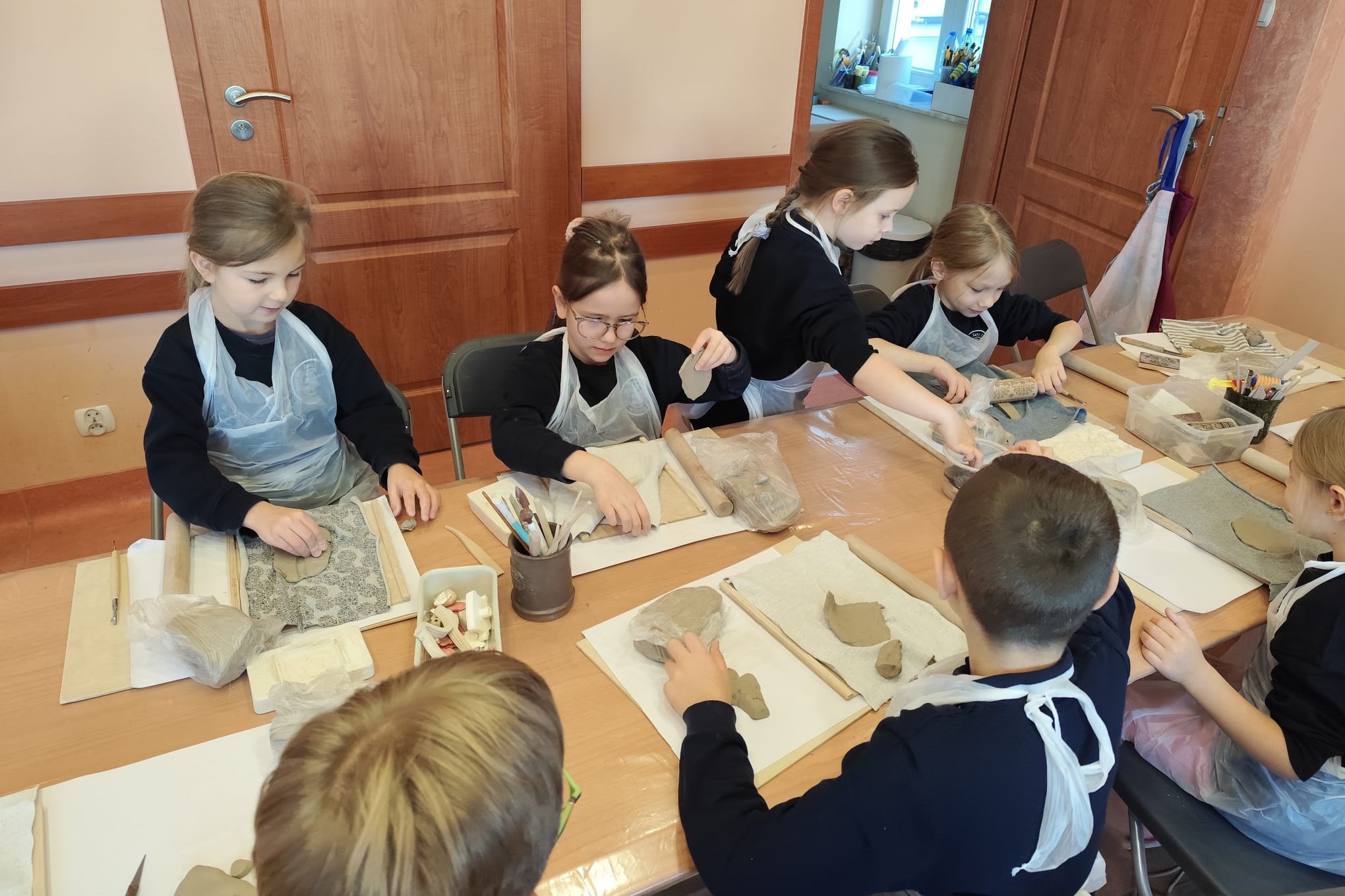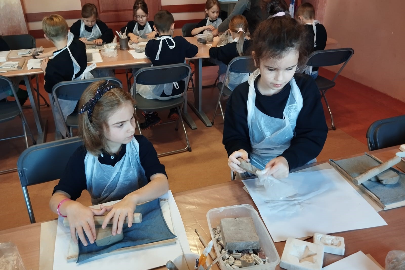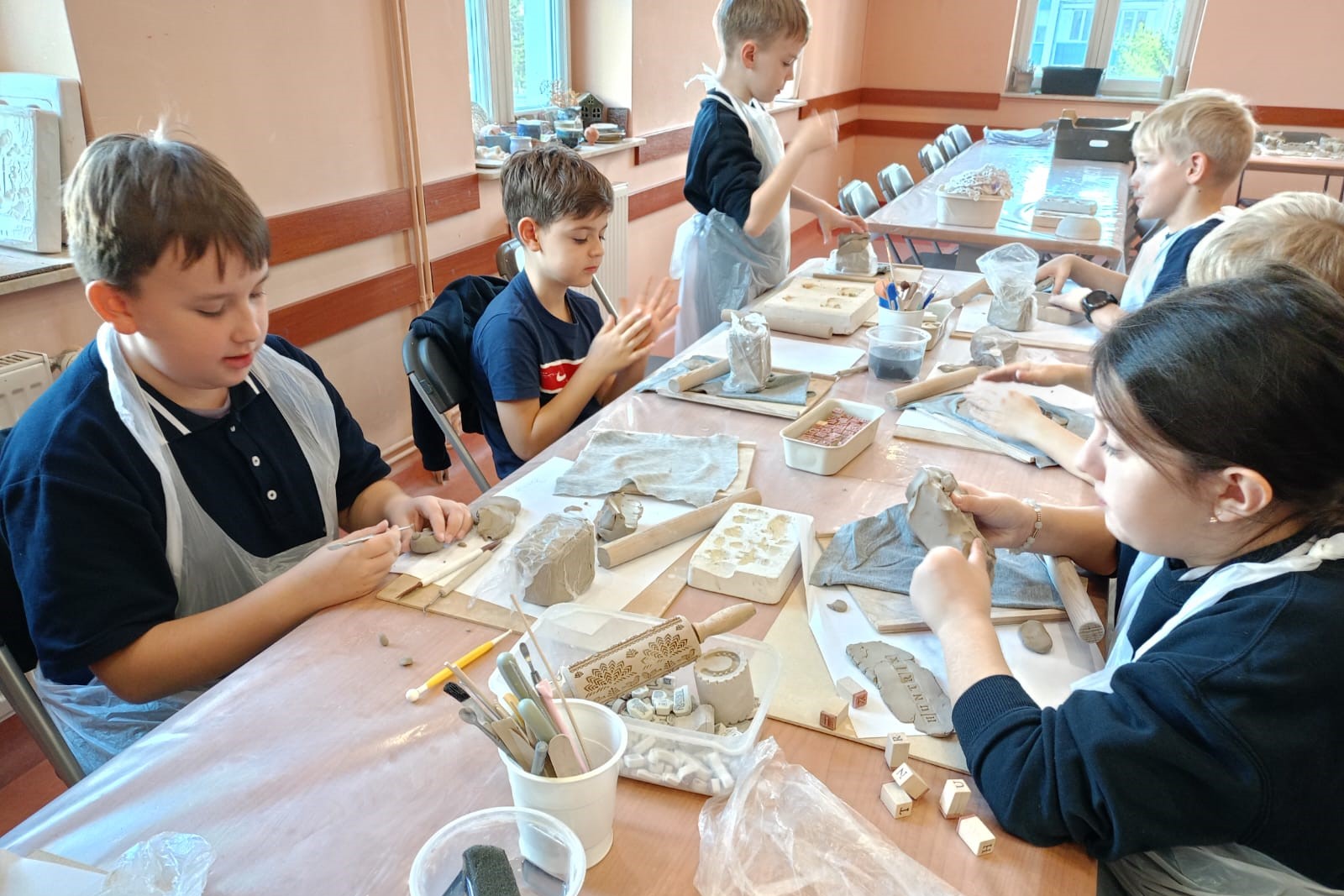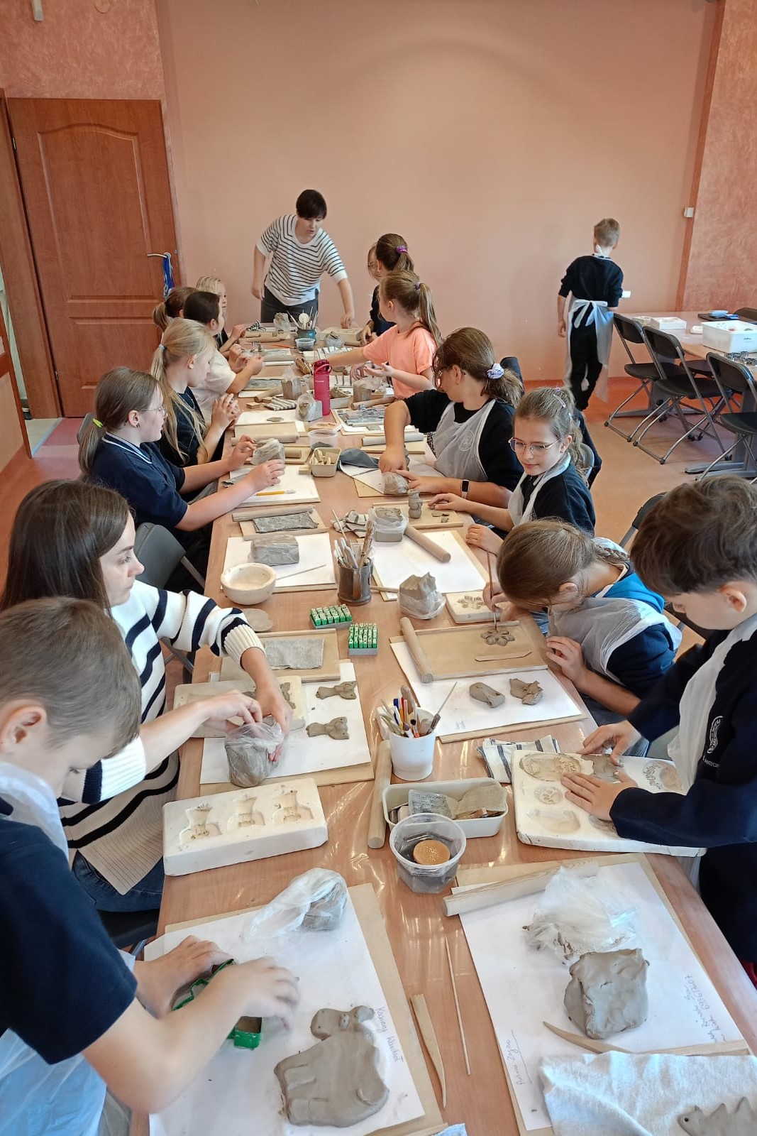 Największą atrakcją warsztatów była część praktyczna, podczas której każdy uczeń mógł samodzielnie ulepić własną pracę z gliny. Powstały m.in. miseczki, figurki, ozdobne płytki oraz inne kreatywne formy. Uczniowie z ogromnym zaangażowaniem odkrywali możliwości plastyczne gliny, rozwijając przy tym swoje zdolności manualne i wyobraźnię.