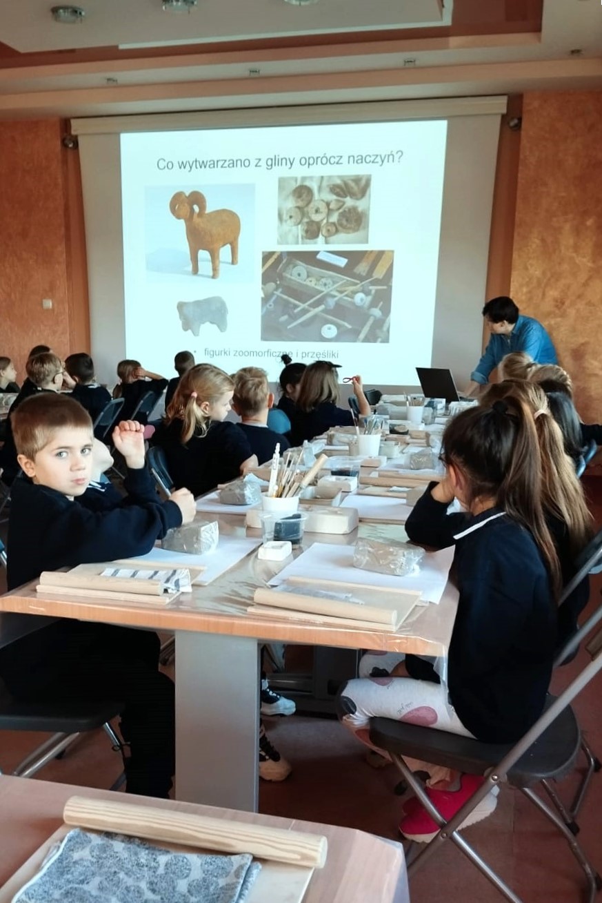 Na początku uczniowie uczestniczyli w krótkim wprowadzeniu dotyczącym historii garncarstwa. Dowiedzieli się, jak powstawały naczynia w pradziejach, kim byli dawni garncarze oraz jakich narzędzi używali. Dzieci miały okazję obejrzeć przykłady pradawnej ceramiki i poznać ciekawostki związane z życiem ludzi w dawnych epokach.