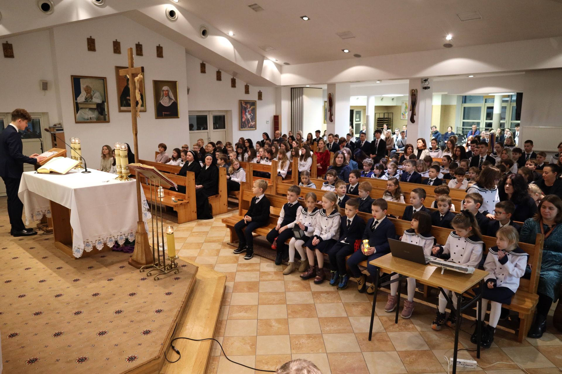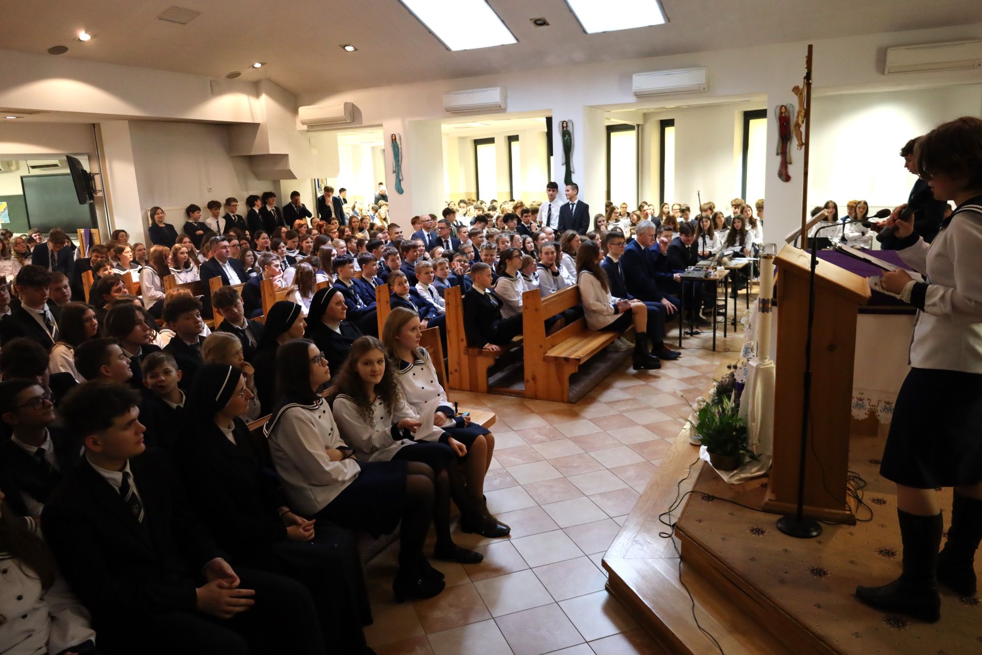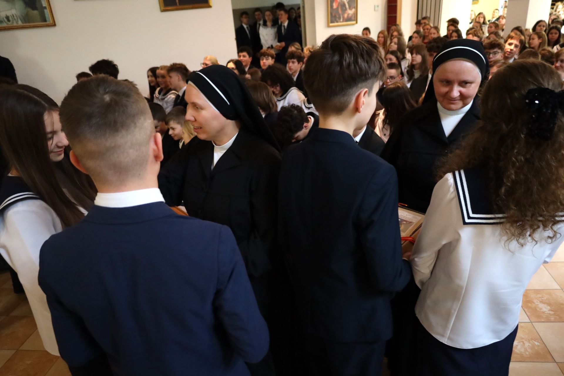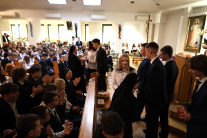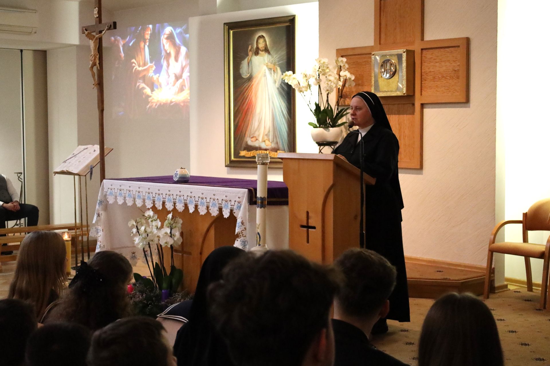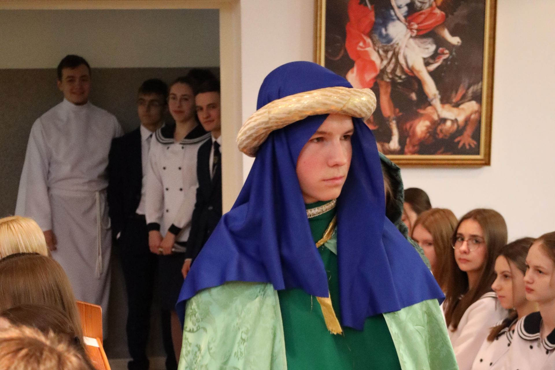 Zwieńczeniem tego wyjątkowego dnia było Misterium Bożonarodzeniowe, w którym uczestniczyły starsze klasy Szkoły Podstawowej oraz całe Liceum. Po poruszającym i skłaniającym do zadumy przedstawieniu życzenia świąteczne całej społeczności szkolnej złożyli Siostra Dyrektor oraz przedstawiciele Samorządu Uczniowskiego SP i LO.