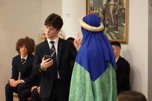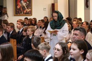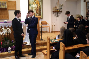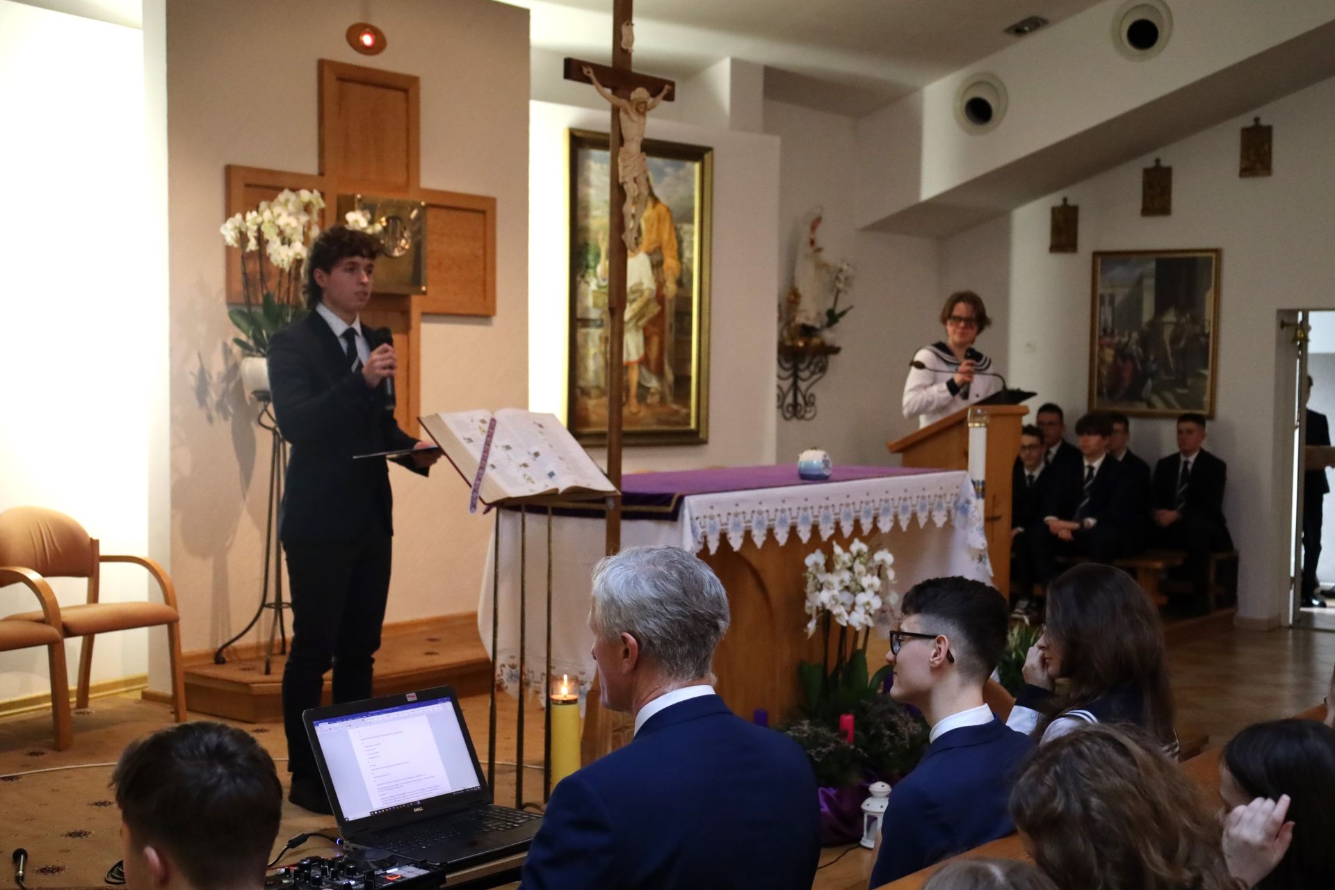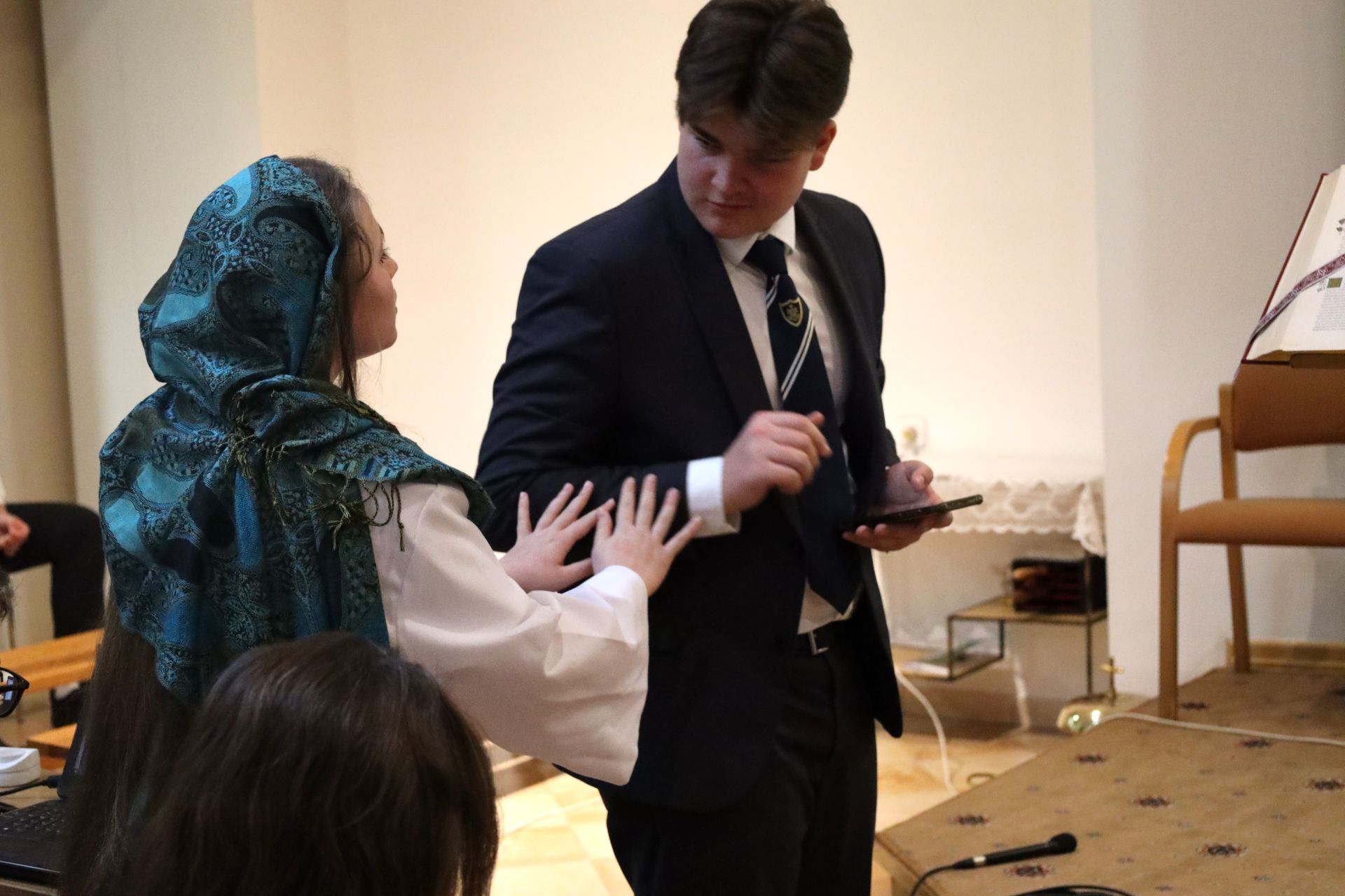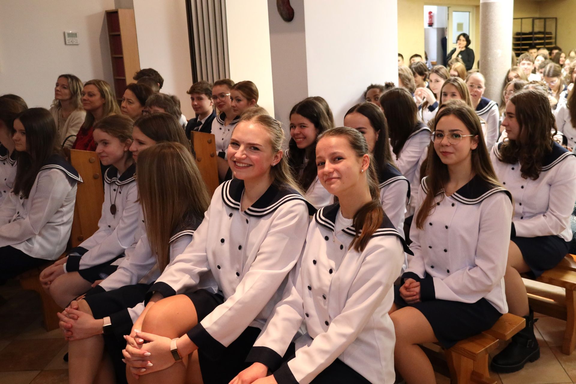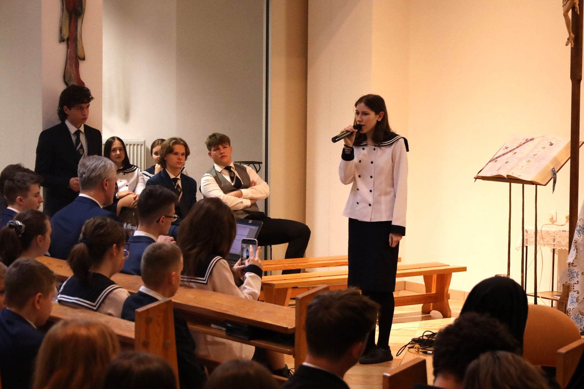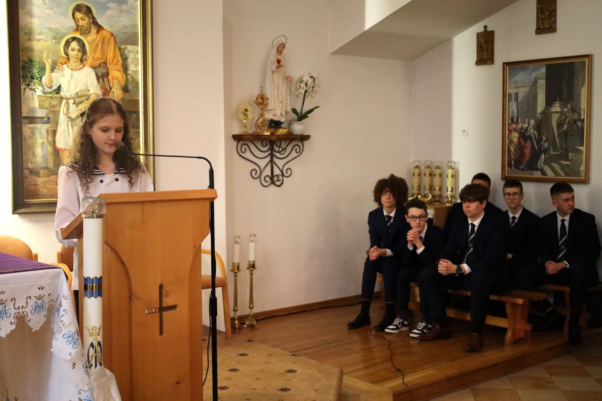 Zwieńczeniem tego wyjątkowego dnia było Misterium Bożonarodzeniowe, w którym uczestniczyły starsze klasy Szkoły Podstawowej oraz całe Liceum. Po poruszającym i skłaniającym do zadumy przedstawieniu życzenia świąteczne całej społeczności szkolnej złożyli Siostra Dyrektor oraz przedstawiciele Samorządu Uczniowskiego SP i LO.
