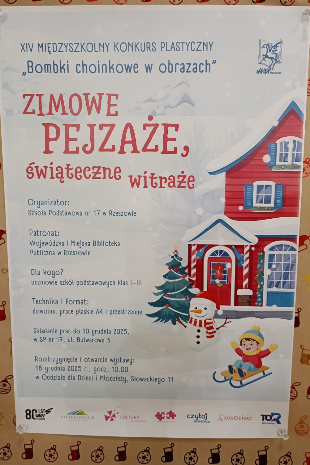 18 grudnia 2025 r. w Wojewódzkiej i Miejskiej Bibliotece Publicznej w Rzeszowie, w Oddziale dla Dzieci i Młodzieży przy ul. Słowackiego 11, odbyło się uroczyste rozstrzygnięcie XIV Międzyszkolnego Konkursu Plastycznego „Bombki choinkowe w obrazach. Zimowe pejzaże, świąteczne witraże”. Wydarzeniu towarzyszyło wręczenie nagród i dyplomów oraz otwarcie wystawy pokonkursowej.