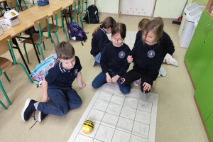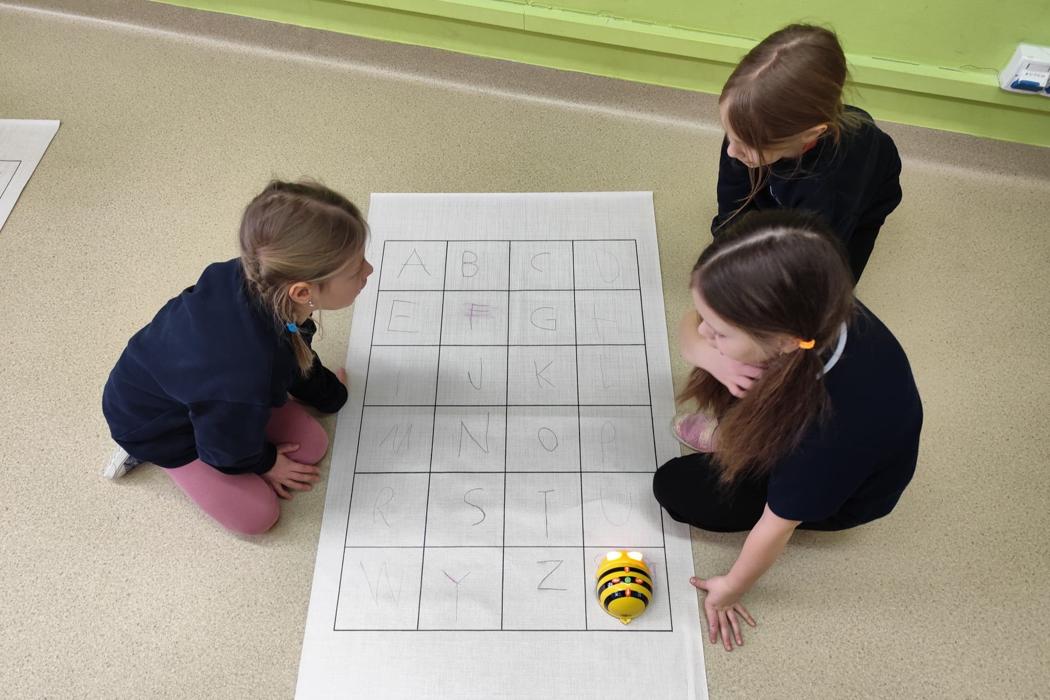 Podczas piątkowych (9 I 2026 r.) zajęć z edukacji polonistycznej uczniowie klasy 1aSP mieli okazję uczestniczyć w niezwykle ciekawej lekcji z wykorzystaniem robota Bee-Bot. Zajęcia odbywały się w grupach i łączyły zabawę z nauką. Dzieci uczyły się obsługi pszczółek Bee-Bot oraz podstaw programowania. Ich zadaniem było zaplanowanie trasy robota w taki sposób, aby przechodząc przez kolejne pola, utworzył określony wyraz. Uczniowie musieli wykazać się współpracą, koncentracją oraz umiejętnością planowania kolejnych kroków.