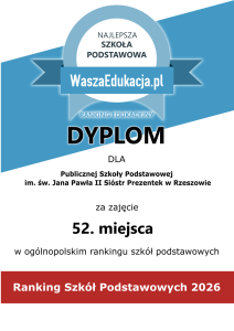 Z radością informujemy, że w opublikowanym przez portal WaszaEdukacja.pl Ogólnopolskim Rankingu Szkół Podstawowych 2026 nasza Szkoła Podstawowa zajęła 52. miejsce w Polsce (spośród przeanalizowanych 9 032 placówek) oraz 1. miejsce w Rzeszowie (spośród 44 szkół).