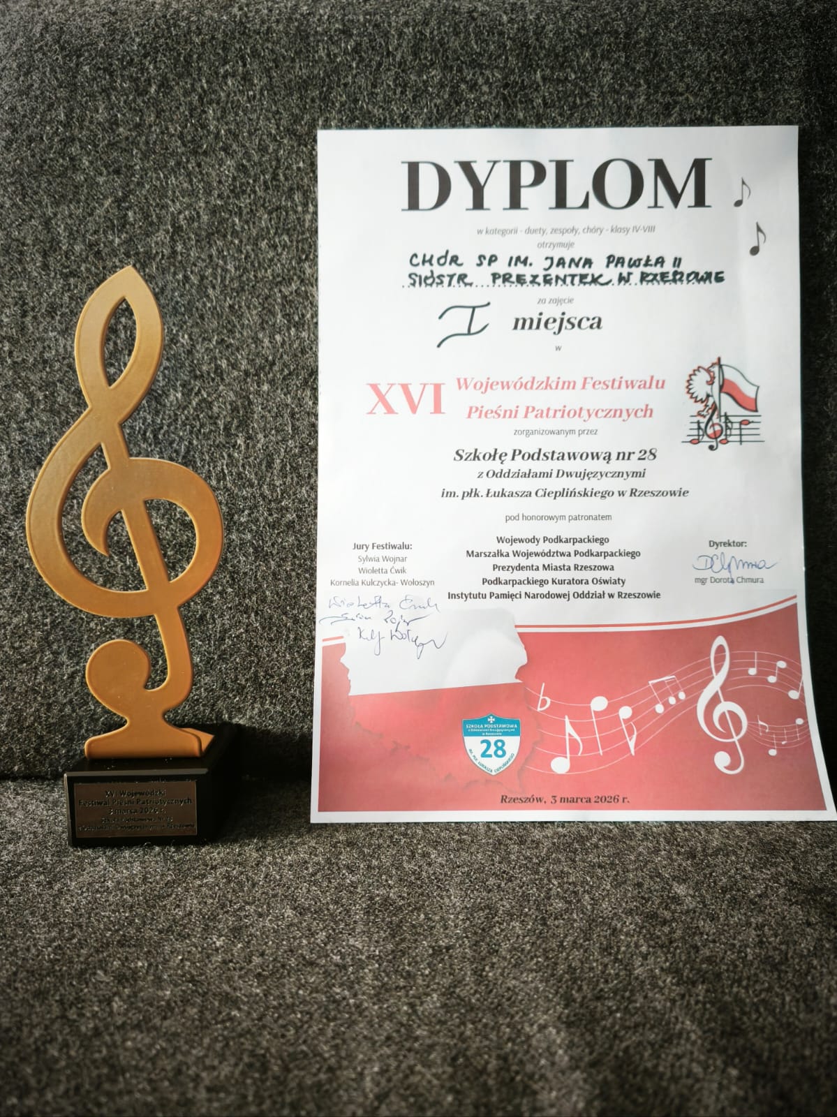 Z radością informujemy, że 3 marca 2026 r. Chór naszej Szkoły Podstawowej zdobył I miejsce w XVI Wojewódzkim Festiwalu Pieśni Patriotycznych, zorganizowanym przez Szkołę Podstawową nr 28 z Oddziałami Dwujęzycznymi im. płk. Łukasza Cieplińskiego w Rzeszowie.