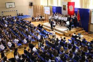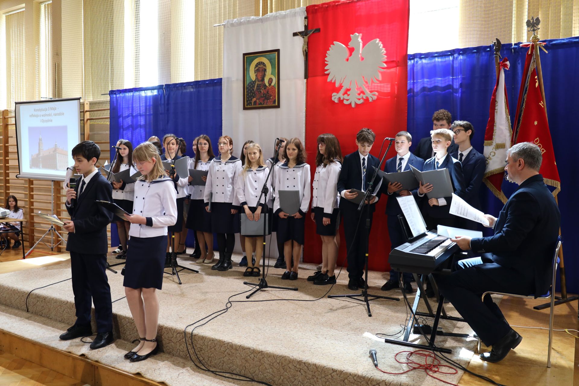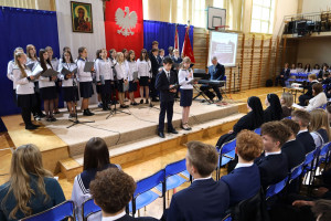 30 kwietnia 2026 r. w naszej Szkole świętowaliśmy rocznicę uchwalenia Konstytucji 3 Maja – jednego z najważniejszych wydarzeń w historii Polski, będącego symbolem dążenia do wolności, odpowiedzialności obywatelskiej i troski o dobro Ojczyzny. Z tej okazji społeczność szkolna (kl. 6-8 SP i I-III LO) miała możliwość uczestniczyć w wyjątkowym, wzruszającym i skłaniającym do refleksji programie artystycznym pt. „Konstytucja 3 Maja – refleksja o wolności, narodzie i Ojczyźnie”. Uroczystość została przygotowana przez wychowawczynie klas 6 Szkoły Podstawowej – panią Małgorzatę Sabat i panią Urszulę Sondej we współpracy z panią Joanną Markowską oraz uczniami tych klas, którzy z dużym zaangażowaniem i wrażliwością przedstawili wartości bliskie każdemu Polakowi.