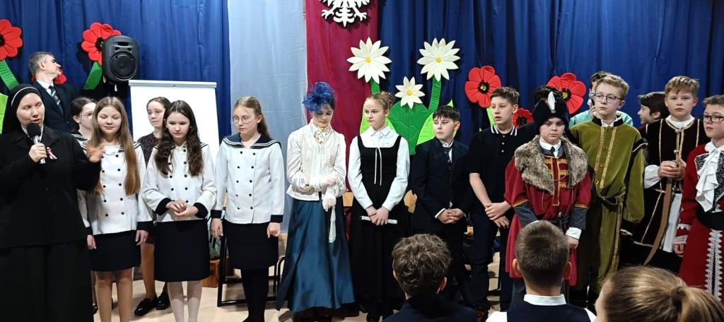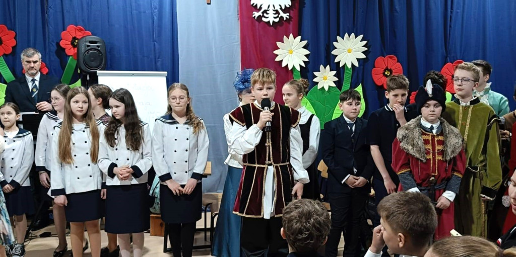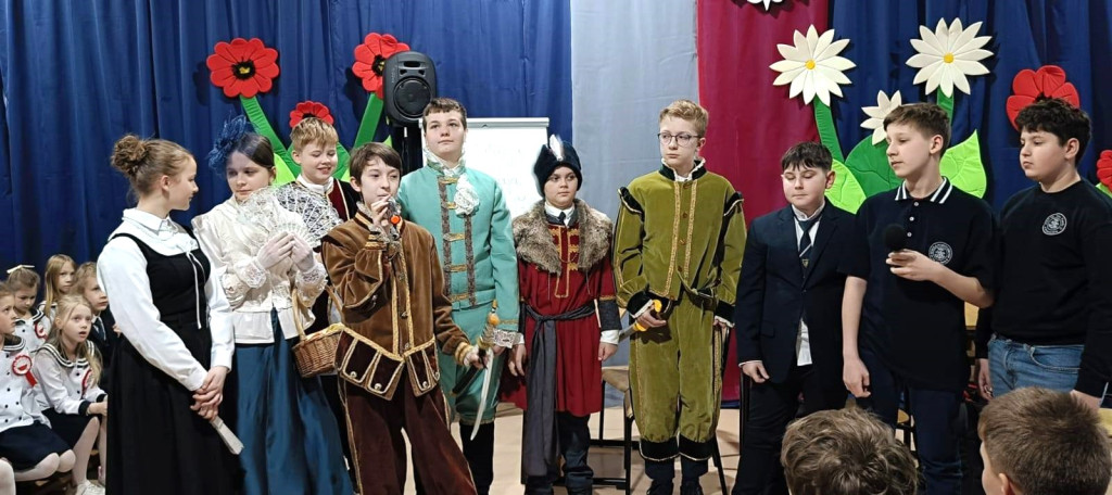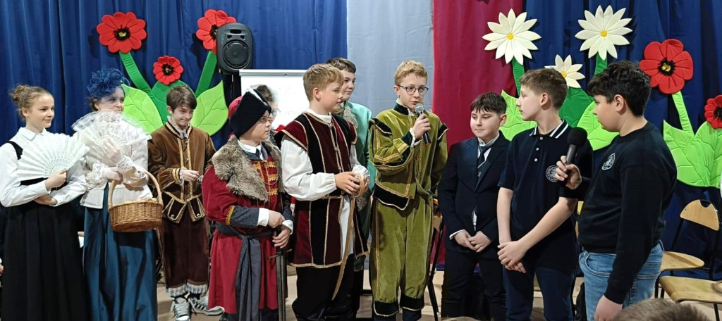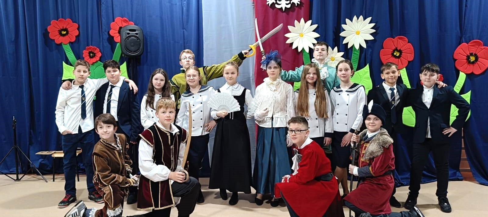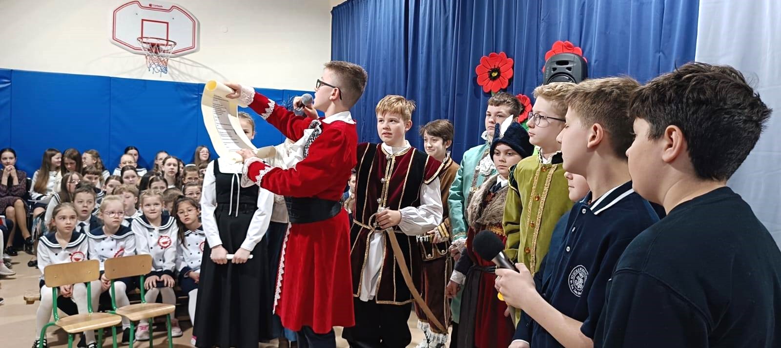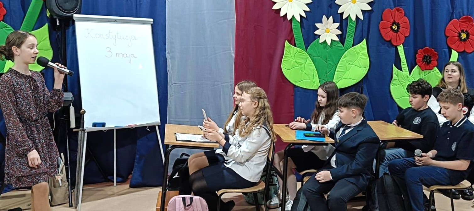 30 kwietnia 2026 r. klasa 5b zaprosiła wszystkich na niezwykłą lekcję historii. Dzięki wehikułowi czasu uczniowie przenieśli się do XVIII w. i mogli być świadkami uchwalenia Konstytucji 3 Maja. Najmłodsi dowiedzieli się, czym jest konstytucja, poznali twórców ustawy rządowej z 1791 r. oraz jej znaczenie dla całego narodu. Aktorzy i widzowie wspólnie szukali odpowiedzi na pytanie, jak dzisiaj można wyrażać patriotyzm.