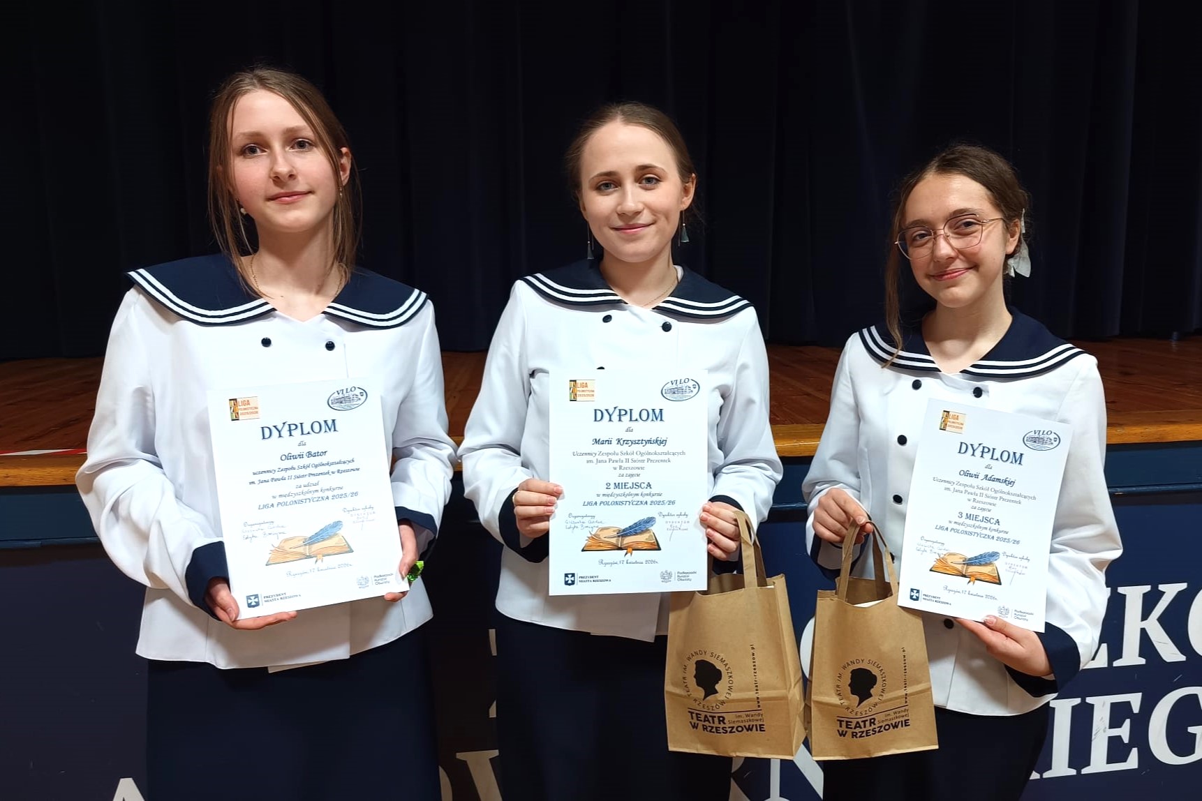 W piątek (17 kwietnia 2026 r.) nasze wspaniałe uczennice brały udział w rozdaniu nagród podczas Gali Ligi Polonistycznej, organizowanej przez VI LO w Rzeszowie. Z radością informujemy, że na ponad 60 uczestników z 10 rzeszowskich szkół średnich nasze: Maria Krzysztyńska oraz Oliwia Adamska – zdobyły odpowiednio – II i III miejsce!